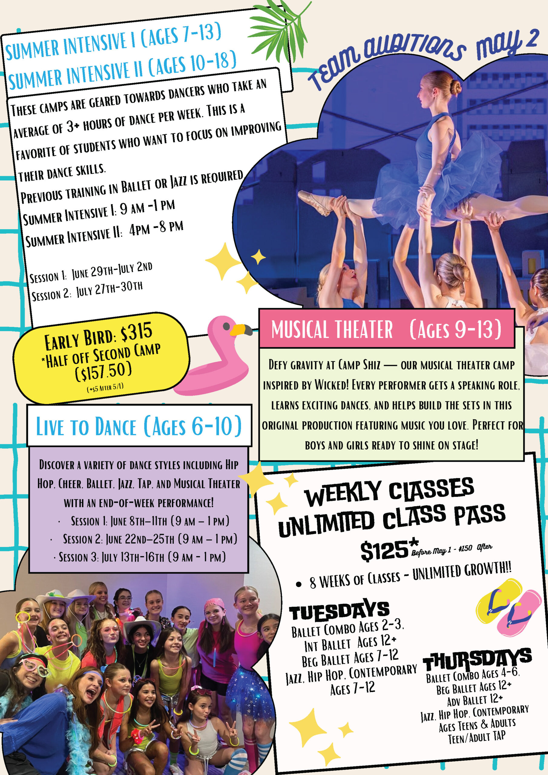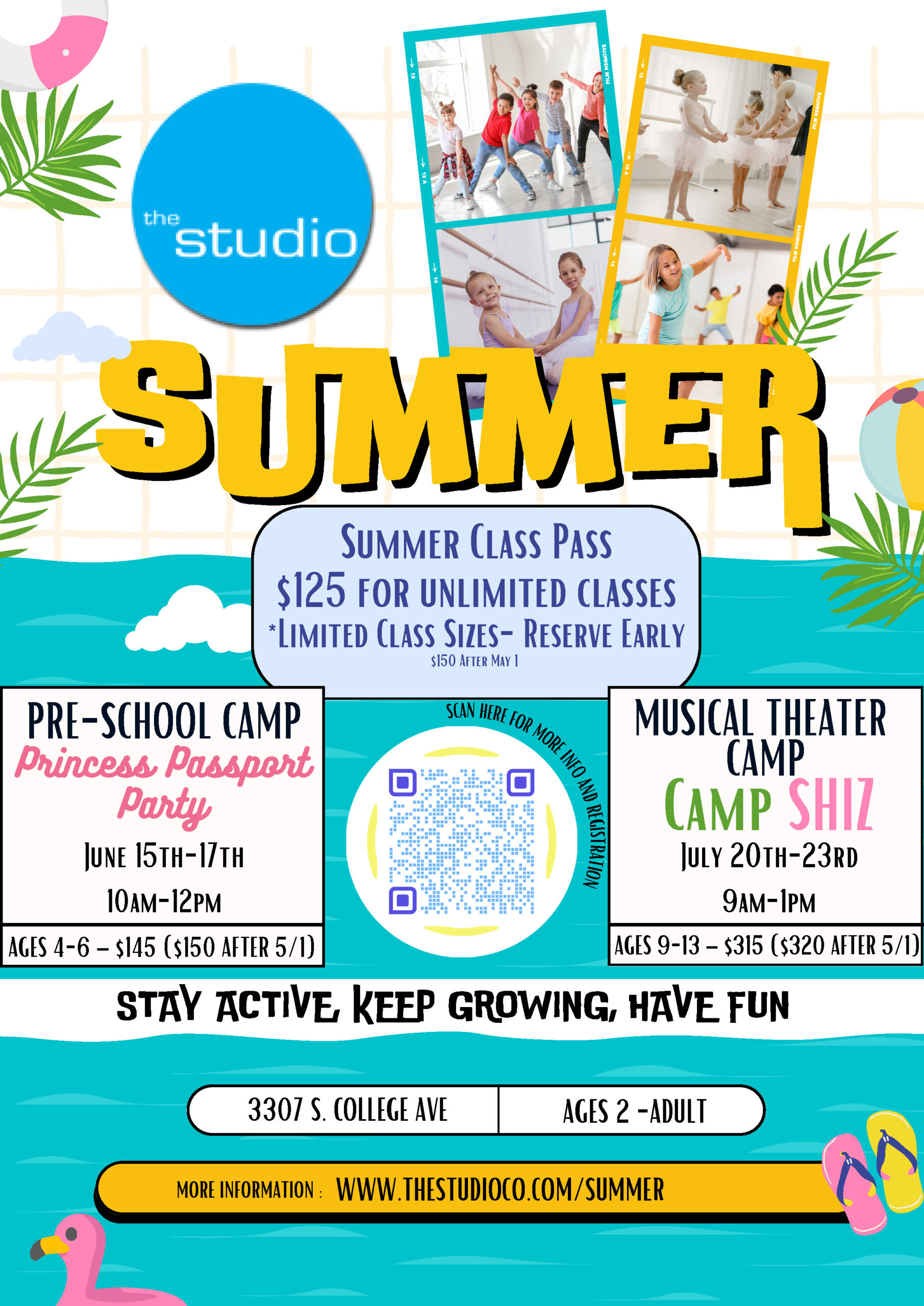 Summer camps may be registered online through your customer portal. If you are new to The Studio, please call us so we can help get your portal set up. All other classes may also be registered online.